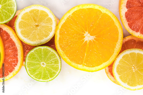Grapefruit, lime, lemon, and orange slices with copyspace