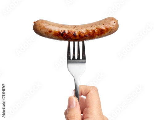 Hand Displaying Cooked Sausage on Fork, isolated on a transparent background