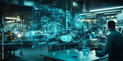 holographic blue blueprint sketches of futuristic mechanical parts floating in the air, on a dark background, surrounded by other workers and machines working in an industrial factory