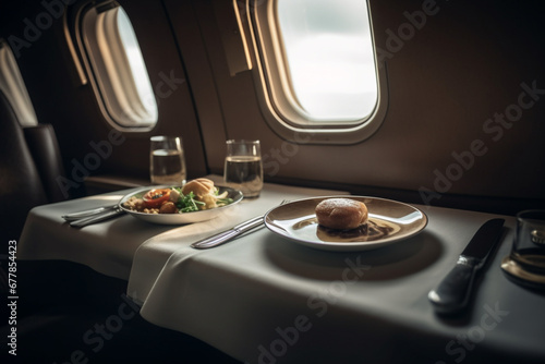 Indulge in exquisite gourmet cuisine aboard a lavish plane, a symphony of flavors with a view from the window. Ai generated