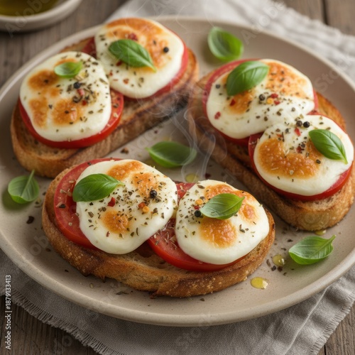 Italian Caprese Bruschetta with Tomato, Mozzarella, and Basil.Hot and Fresh Tomato Mozzarella Toasts on a Plate.