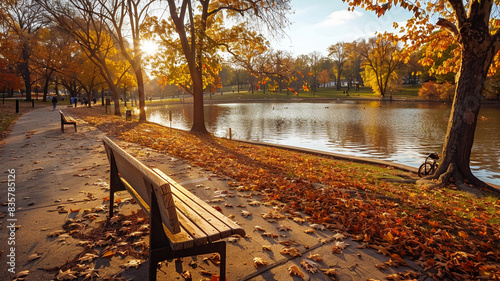 landscape autumn fall lake sunset maple tree, foliage, wooden table wallpaper background