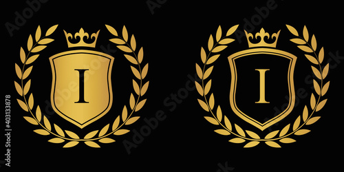 Letter I golden laurel wreath template logo Luxury shield letter with crown. Monogram alphabet . Beautiful royal initials letter.