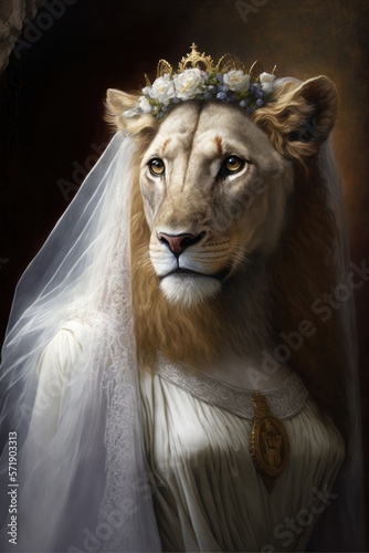 Lion dressed up in wedding dress. Generative AI