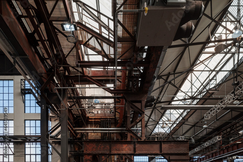 Low angle interior view of the ceiling with rusty steel structure and skylight of industrial building or factory.