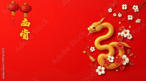 Luxury Red and Gold Chinese New Year 2025 Background – Creative Snake Zodiac Design with Lanterns and Floral Motifs, Chinese New Year copy space background, 2025 Lunar New Year Celebration