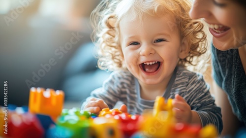 parent and a young child playing with toys together, both laughing and interacting, on a simple