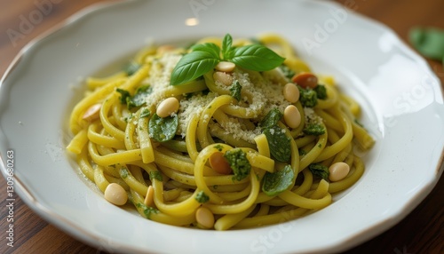 Pesto Pasta with Broccoli and Pine Nuts on a White Plate