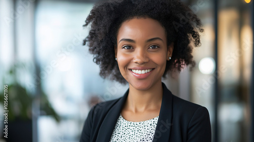 Portrait of a beautiful, smiling African American business woman with curly hair in an office