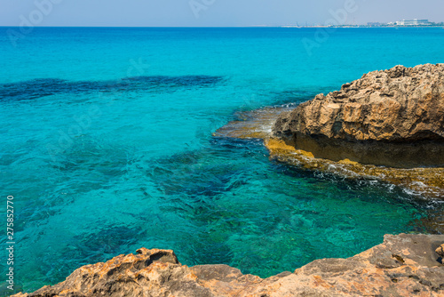 pristine seascapes with crystal clear blue water and yellow rocks in Ayia Napa, Cyprus
