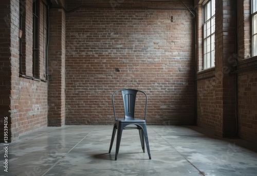 Raw industrial aesthetic featuring a metal chair surrounded by exposed brick, concrete, and natural light.