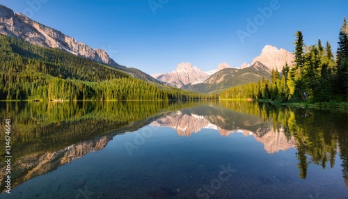 Serene mountain range reflected in crystal clear lake, showcasing nature beauty