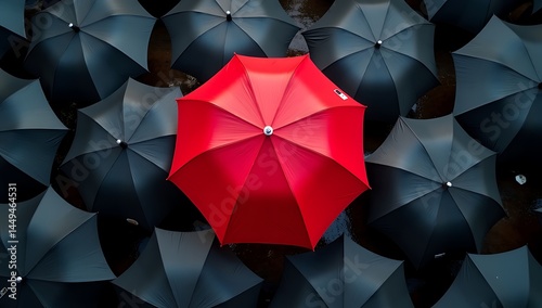 Single red umbrella among a sea of black umbrellas on a rainy day, viewed from above