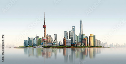 Skyline with Famous Pudong Skyscrapers and River Reflection