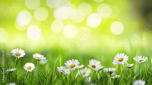 Spring background with daisies and green grass, soft, blurred bokeh effect, spring concept