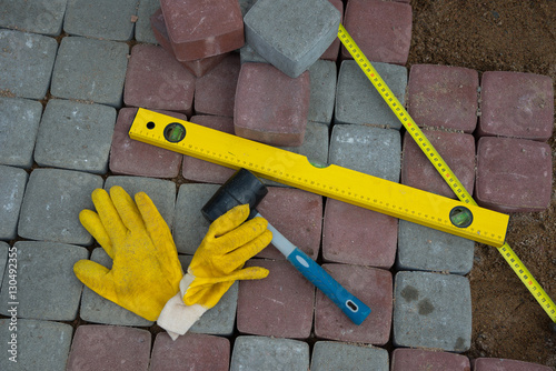 stone blocks rubber hammer level gloves and tape measure