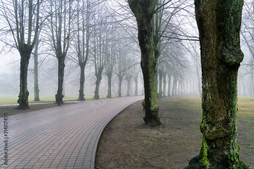 Thick dense fog with poor visibility on a cold winter morning in the park.