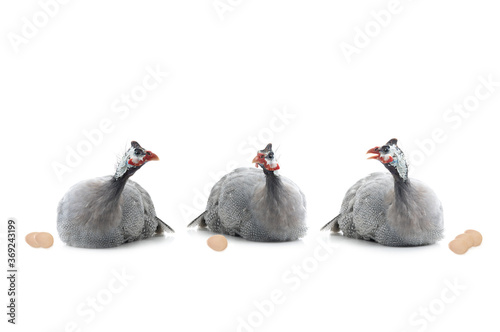 three guinea fowls are fighting among themselves isolated on white background.