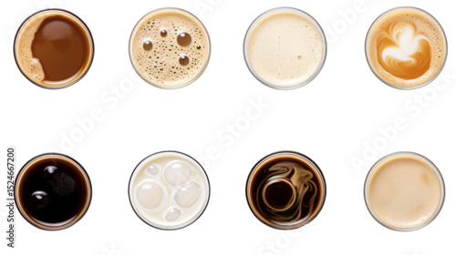 Top view of various coffee drinks in cups arranged side by side on transparent background