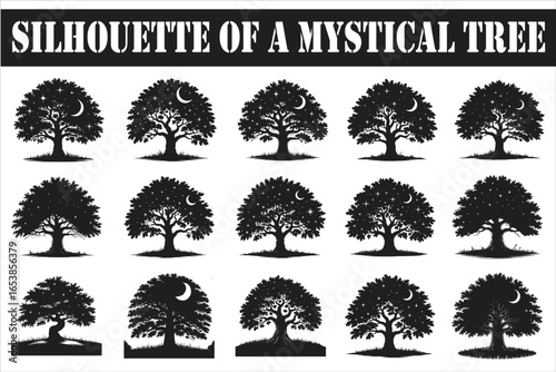 Tree with the Moon and star vector . This elegant vector design features a symbolic tree silhouette paired with celestial elements,