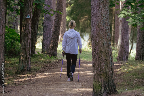 Woman in a wite suit with Nordic walking sticks. In a beautiful sunny autumn park. Healthy lifestyle.