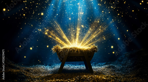 wooden manger filled with soft straw, illuminated by a single beam of divine light in a dark, nearly pitch-black environment.