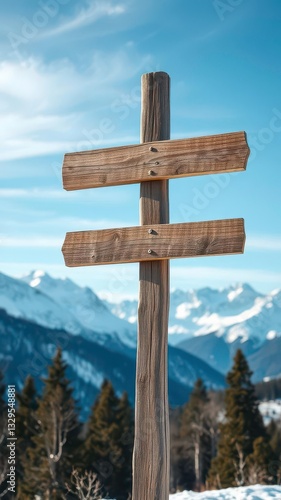 Wooden Signpost with Snow Capped Mountains in the Background and a Clear Blue Winter Sky
