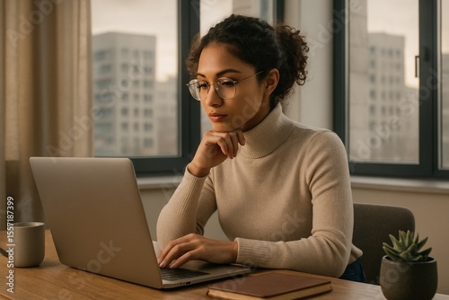 Young woman with curly hair and gold-rimmed glasses working on a laptop at a wooden desk in a bright, modern room with city view.