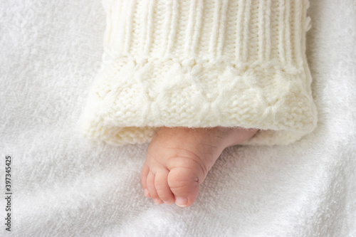 白いセーターを着た赤ちゃんの足(0歳、生後5か月、女の子)