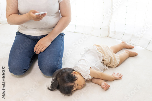 スマートフォンを使う母親と、窓際で寝る赤ちゃん(1歳、日本人、女の子)