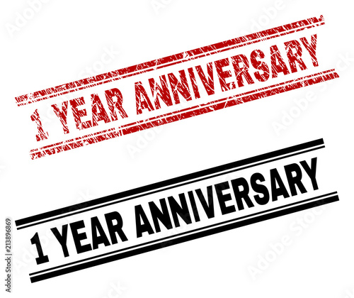 1 YEAR ANNIVERSARY stamp seal print with red grunge and clean black version. Red vector rubber print of 1 YEAR ANNIVERSARY tag with dust texture. Labels are placed between double parallel lines.