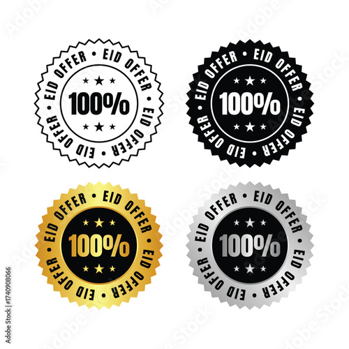 100 percent four eid offer stickers in black white gold and silver with star accents and text elements