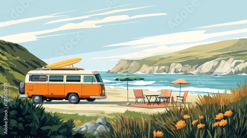 106.A detailed vector image of a classic station RV camper van with a surfboard on the roof, a beachside picnic setup with chairs and umbrellas, and rolling hills in the background.