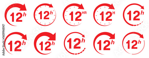 12 hours service icon vector set. Red 12h duration sign. Red 12 hours clock arrow icons, work and delivery time symbols. Red 12hr support sign collection.