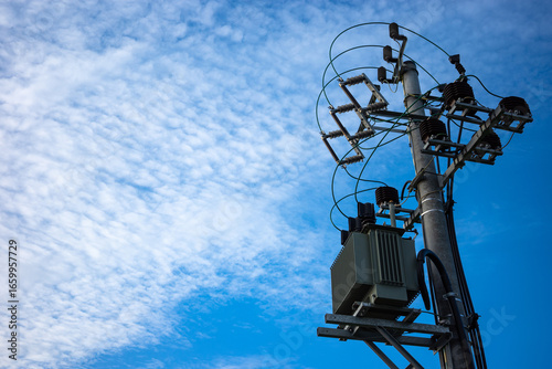 15kV power transformer on top of the electic pole. Local network of power supply.