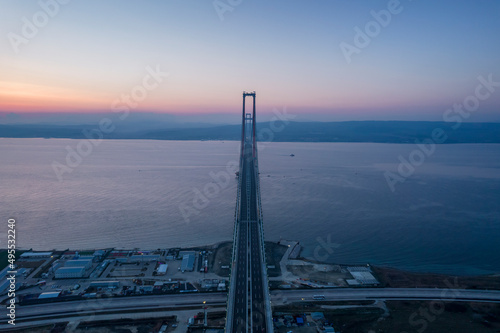 1915 Canakkale Bridge aerial view in Canakkale, Turkey. World's longest suspension bridge opened in Turkey. Turkish: 1915 Canakkale Koprusu. Bridge connect the Lapseki to the Gelibolu..