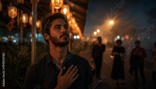 西洋の男性20代が光影の祭りで異文化の熱気を体感する夜