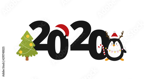 2020 New year greeting card design. Christmas tree and cute penguin. Vector