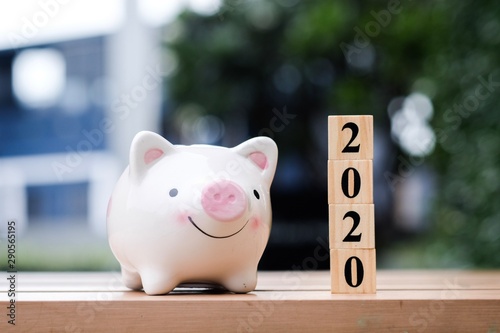 2020 wooden block number with piggy bank.