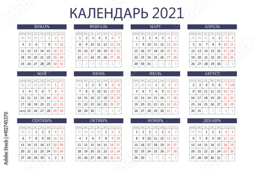 2021 calendar planner. Corporate week. Template layout, 12 months yearly, white background. Simple design for business brochure, flyer, print media, advertisement. Week starts from Monday.
