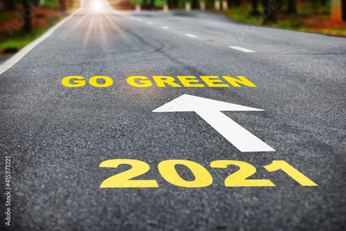2021 go green on asphalt road surface with marking lines. Sustainable future concept and Inspiration with motivation idea