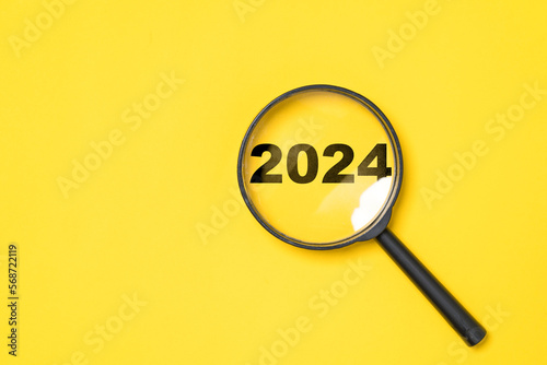2024 year inside of magnifier glass on yellow background for focus and preparation new year change and start new business target strategy concept.