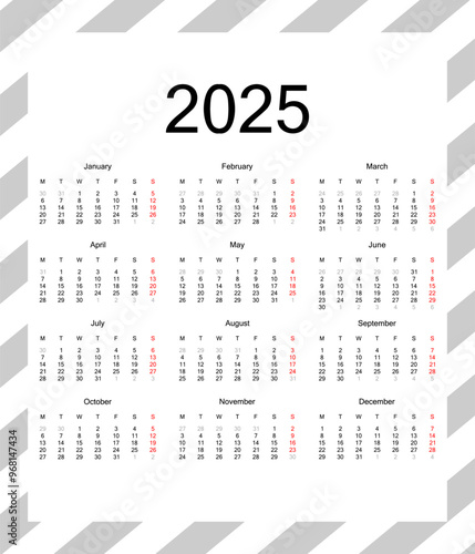 2025 Calendar Grid. Calendar 2024, 2025 year - vector illustration. Week starts on Sunday. Calendar for 2025 years