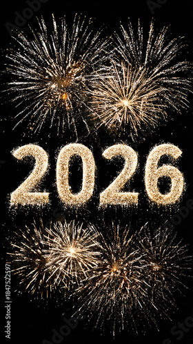 2026 New Year celebration with golden fireworks on dark night background festive holiday