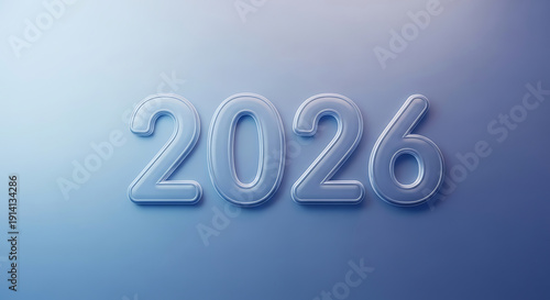 2026 year rendered in soft transparent blue glass on blue gradient background