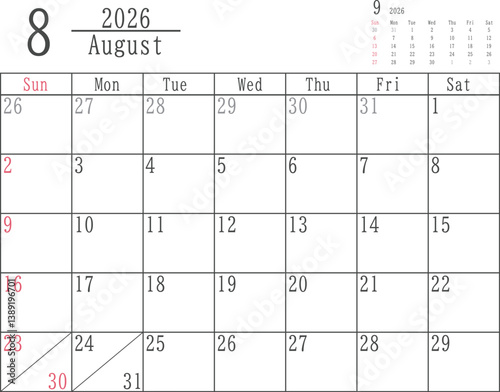 日曜だけ色付きのシンプルな2026年8月のマンスリーカレンダー素材