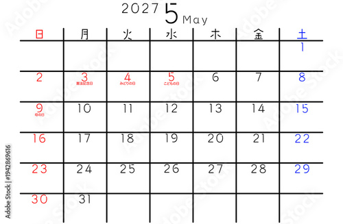 2027年シンプルカレンダー 5月 曜日日本語