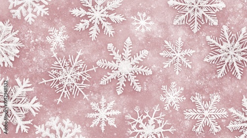 2410 64.Snowflakes fall gracefully against a pink background, their intricate shapes standing out in crisp white. The combination of the soft pink color and the delicate snowflakes creates a