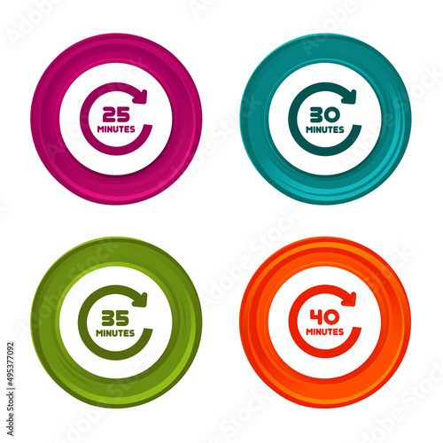 25, 30, 35 and 40 Minutes rotation icons. Timer symbols. Colorful web button with icon.