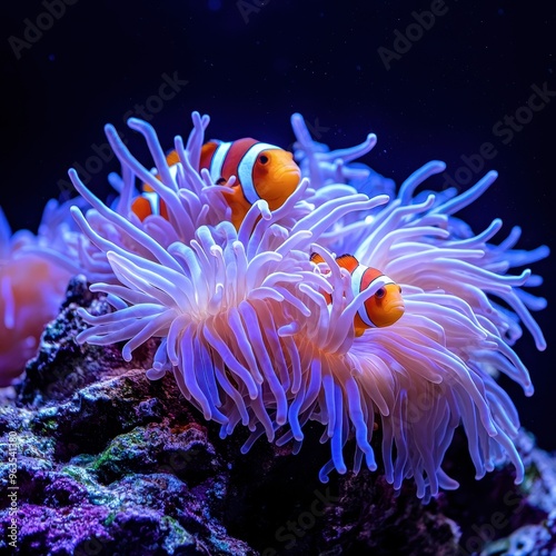 29. Exotic underwater scene with sea anemones and clownfish, beautifully unique and colorful